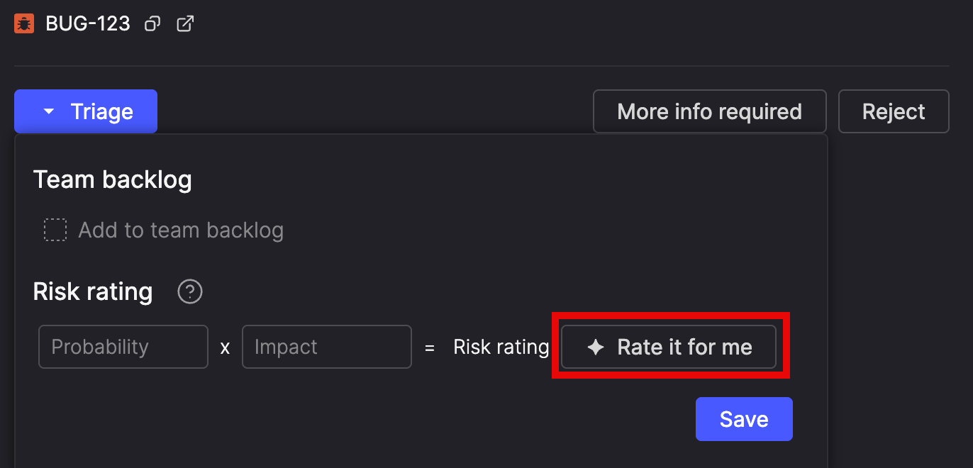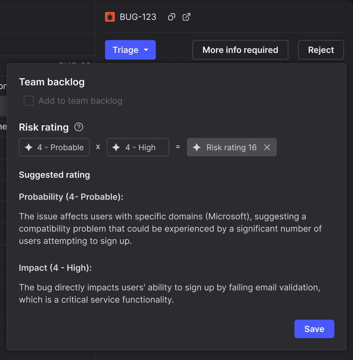 When triaging a bug, you can now click ✦ Rate it for me to have Atono suggest probability and impact values based on similar issues your team has rated before.