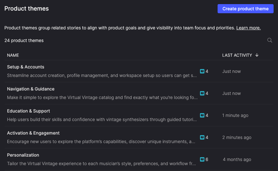 Product themes now support descriptions, making it easier to explain their goals. You can also navigate directly from a story to its theme for context, and the product themes list is sorted by recent activity so the most relevant ones stay visible. These changes make product themes clearer and more practical for grouping stories around broader objectives.