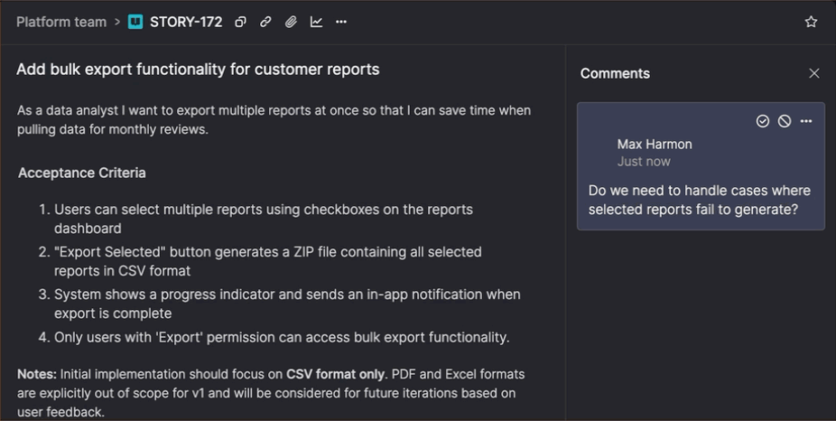 Copy a direct link to any comment from its menu. When someone follows the link, the backlog item opens with the comment highlighted. Links remain valid even if you split the story and the comment moves to a different item, so conversations stay connected to the relevant context no matter how work evolves.