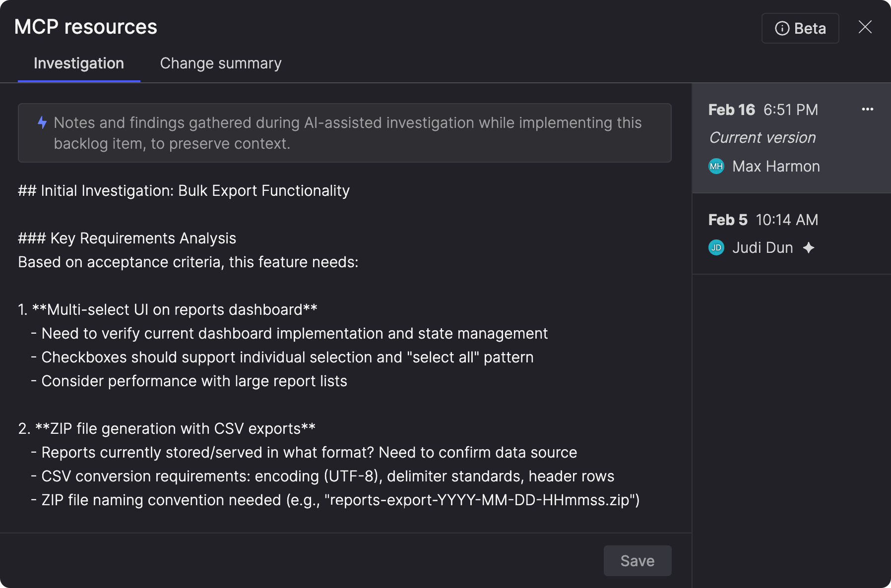 MCP resources have two sections: Investigation captures what AI agents learned before making changes—findings, constraints, relevant files, and recommended next steps. Change summary tracks what was actually implemented—files modified, tests updated, and current status.