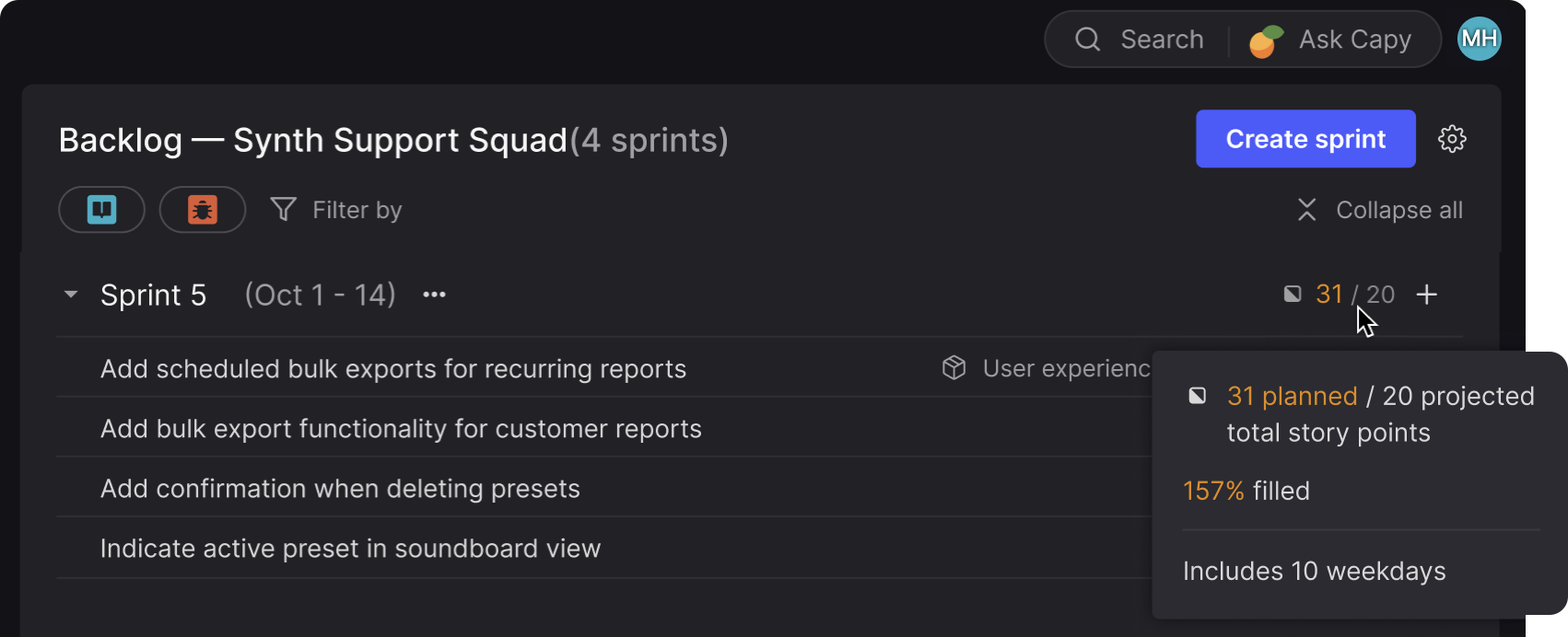 The same projections appear on your backlog view and sprint detail pages, updating in real time as you add, remove, or resize stories.