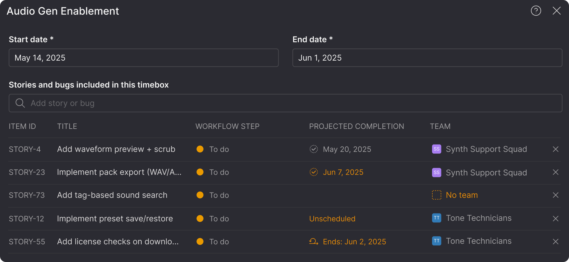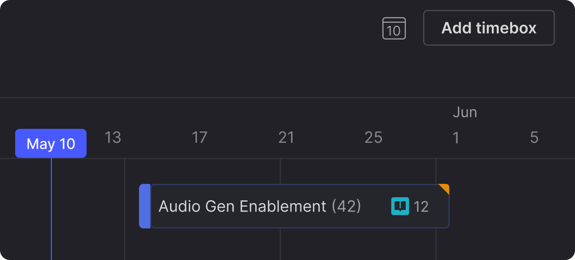Planning across multiple teams with different workflows, all working toward a shared release is where coordination gets complex. The timeline view now flags timeboxes that have potential delivery issues before deadlines arrive. When you view a timeline, timeboxes ending within the next three months show a warning indicator if there are problems with the plan.