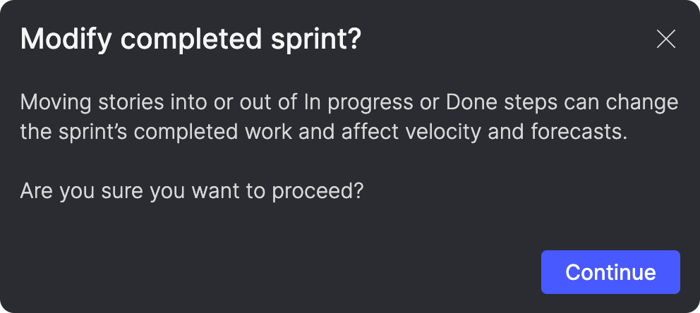 You'll see warnings before actions that affect burndown accuracy or historical data. Each warning explains what will happen so you can make an informed decision.