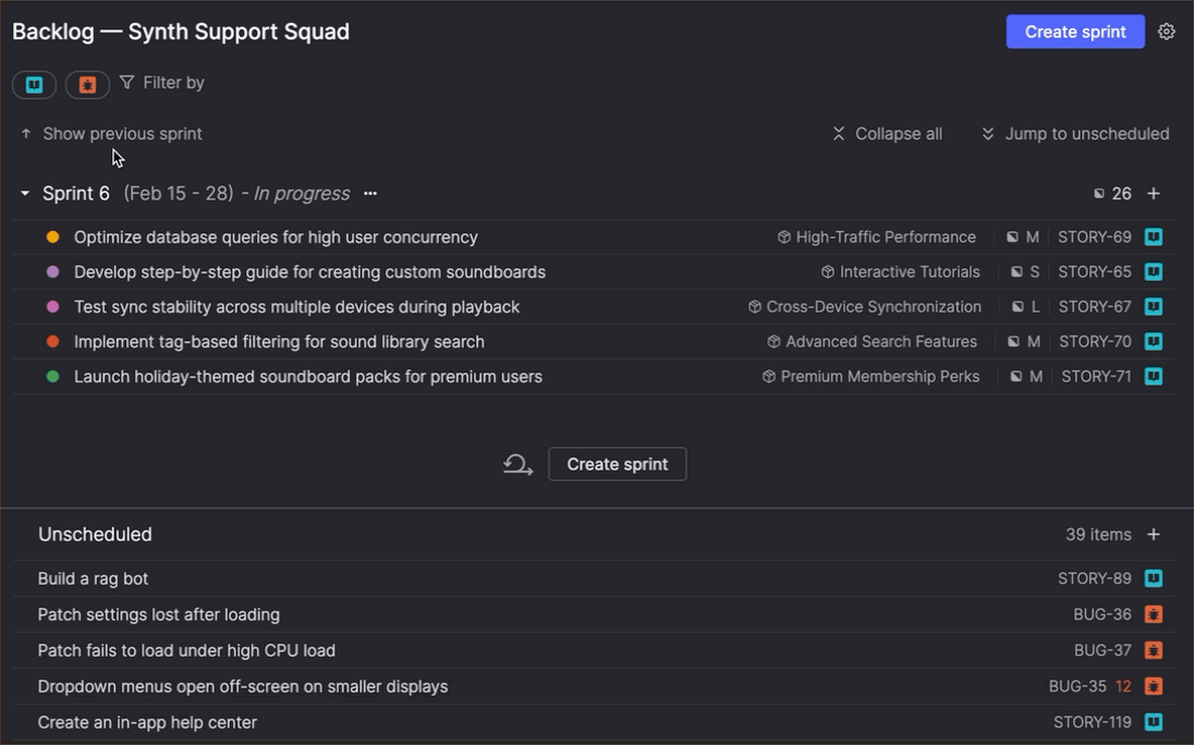 - Navigate sprints more efficiently by collapsing and expanding sprints to focus on what matters, browsing past sprints to see what shipped, and tracking how items moved through sprints over time.