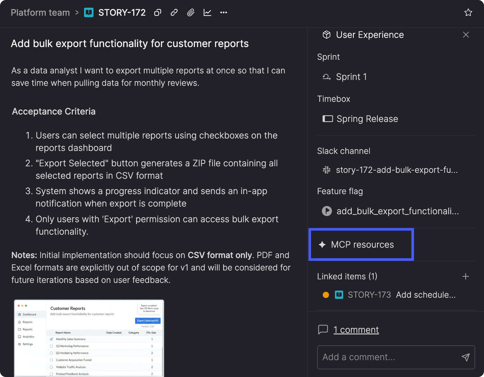 We’re introducing MCP resources—a way for AI coding assistants to store investigation notes and implementation changes directly on backlog items. The next person or AI session can pick up where the last one left off, because the important context lives on the item itself.