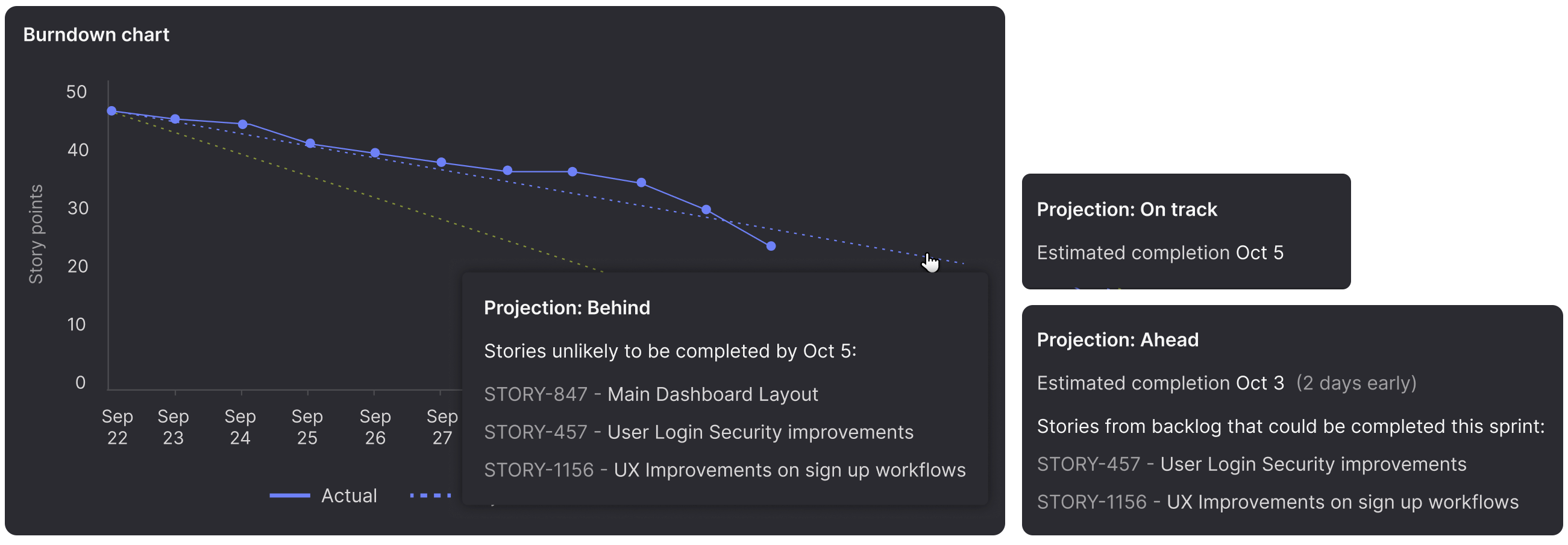 These aren't just projections. They're conversation starters. Should we extend the sprint? Reduce scope? Pull in help from another team? The chart gives you the data to make those calls while there's still time.