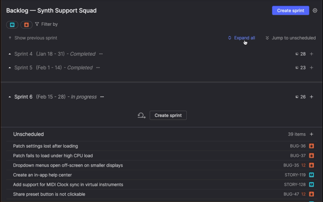 Scrum backlogs now let you collapse and expand sprints individually, or collapse and expand all sprints at once. This helps you focus on planning the next sprint, reviewing the current one, or checking what shipped last month without scrolling through everything.