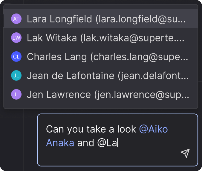 - Coordinate with teammates through contextual notifications by mentioning users in comments to pull them into conversations, with intelligent batching that reduces email noise.