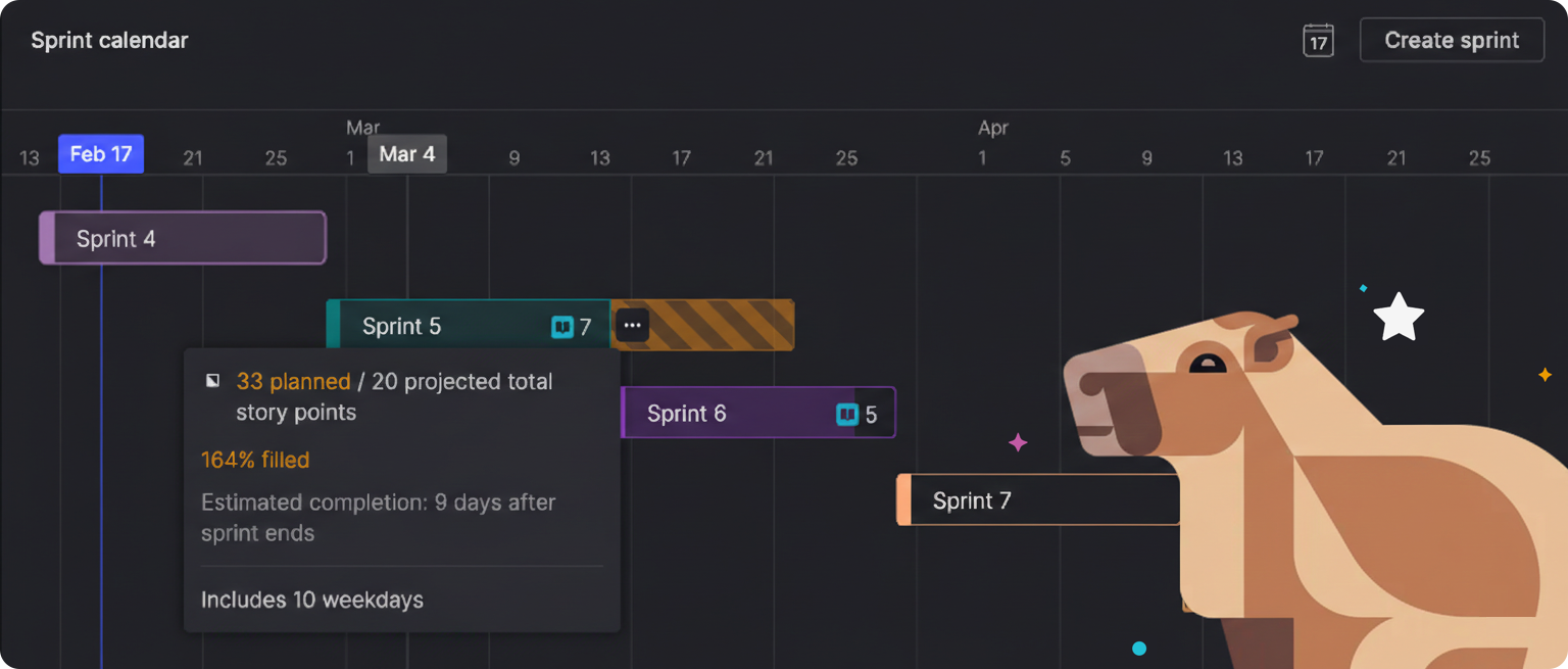 These features use historical delivery data to help you build plans quickly and adjust as you execute—projecting capacity, flagging cross-team risks, and showing you mid-sprint whether you're on track, while there's still time to make tradeoffs.