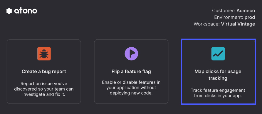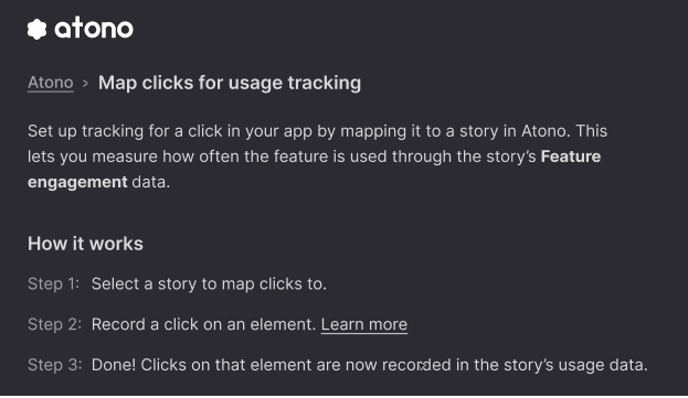 Once the Atono SDK is set up, there’s no additional developer work required to capture user engagement. With this release, the Atono Chrome extension now enables product managers and other non-technical roles to map a click in your product directly to a story. Every subsequent click is tracked as usage in Atono, tying real interactions back to the work that delivered them.