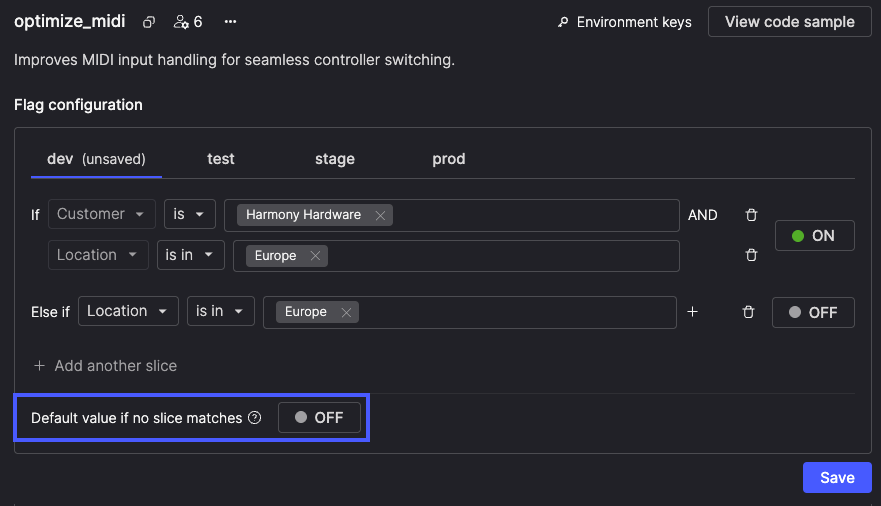 When configuring a feature flag, the default condition now appears last in the list of slices. Because slices are checked first and the default only applies if none match, this order makes rollout plans read chronologically so they're easier to understand at a glance.