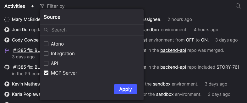 See exactly where each activity came from—whether it was performed in the Atono interface, triggered by an integration, sent through the API, or completed by the MCP server. You can filter the Activities list by source to focus on specific origins.