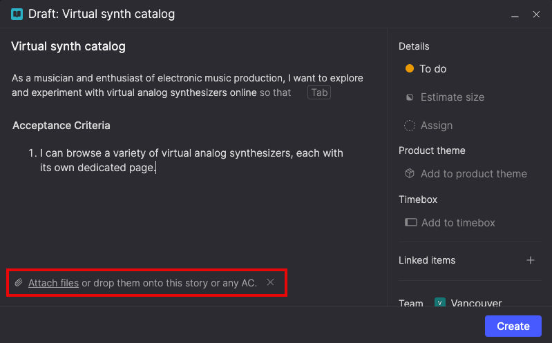 New visual cues clarify where attachments can be added—whether you’re creating a draft, updating an existing item, or attaching files to specific acceptance criteria.