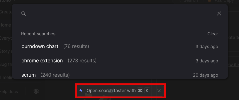 Press Cmd-K (Mac) or Ctrl-K (Windows/Linux) from anywhere to open search, without breaking your flow.