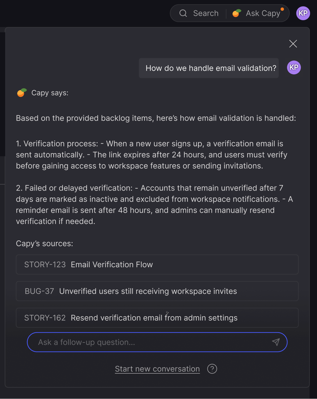 Capy searches your completed stories and bugs for relevant answers. It summarizes what it finds and shows the sources it used—so you can confirm them yourself.