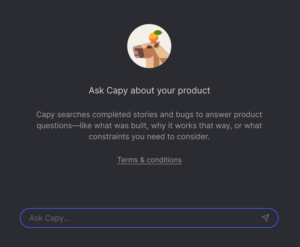 Ask Capy helps your team understand how your product works by reading through completed stories and bugs. Just ask a question in plain language, and Capy finds answers based on your team’s actual work—so you don’t have to dig through old tickets or wait for someone to reply.