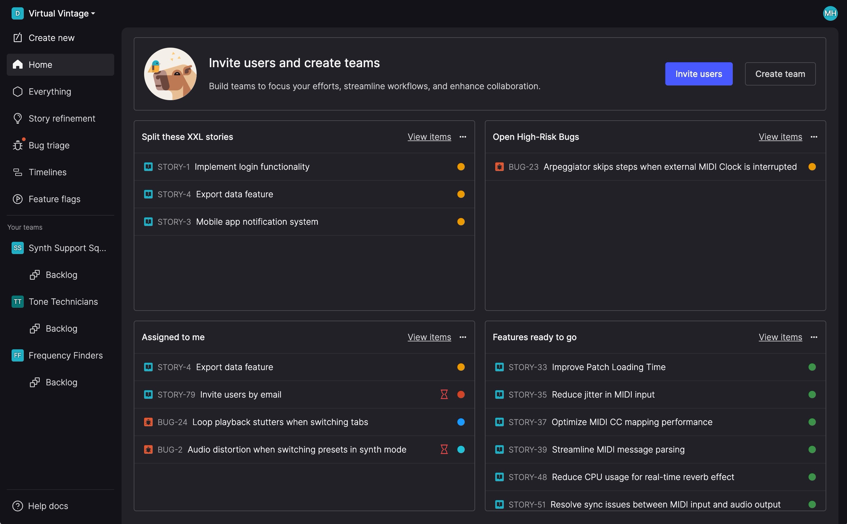 Your Home page is the launchpad for your Atono experience. From here, you can invite users, create teams, connect to Slack, and keep an eye on the items assigned to you. You can also customize your Home page with widgets that surface views of stories and bugs from across your workspace.