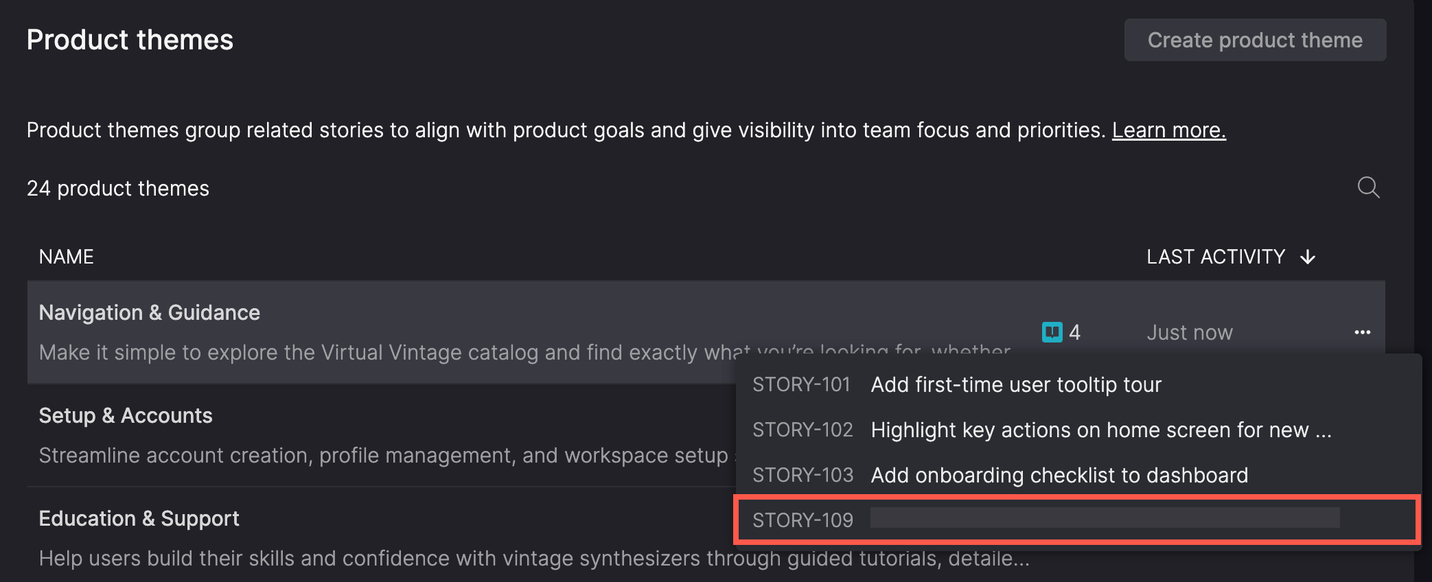 Keep your workspace organized by creating, editing, or deleting product themes to ensure your stories align with your organization's goals and priorities.