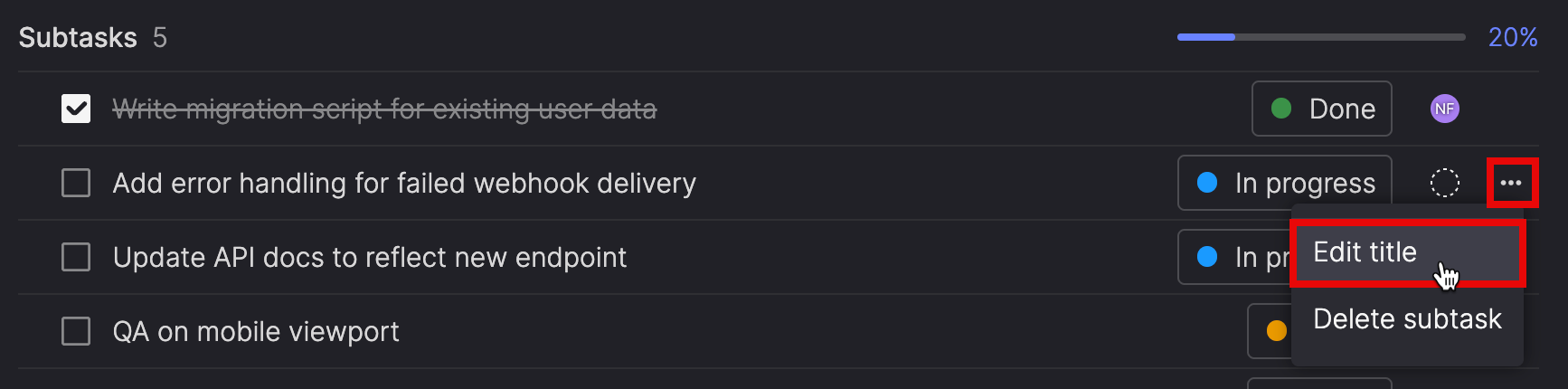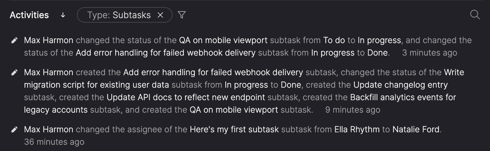 Once you've added subtasks, you can check them off, update their status, assign them to teammates, reorder them, or delete them.