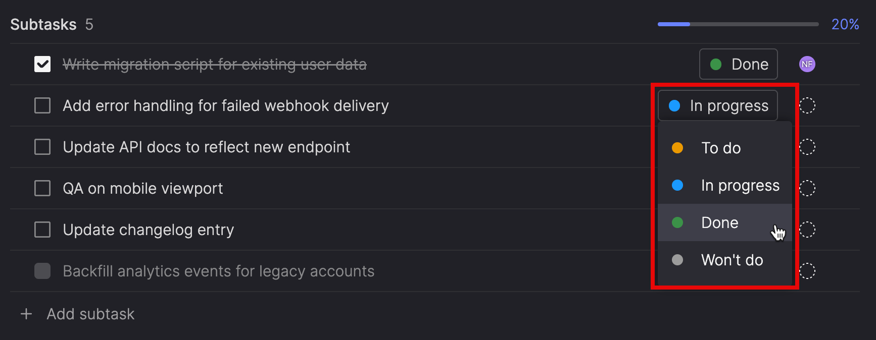 To change the status of a subtask, click its current status (new subtasks default to To do) and select a different status.