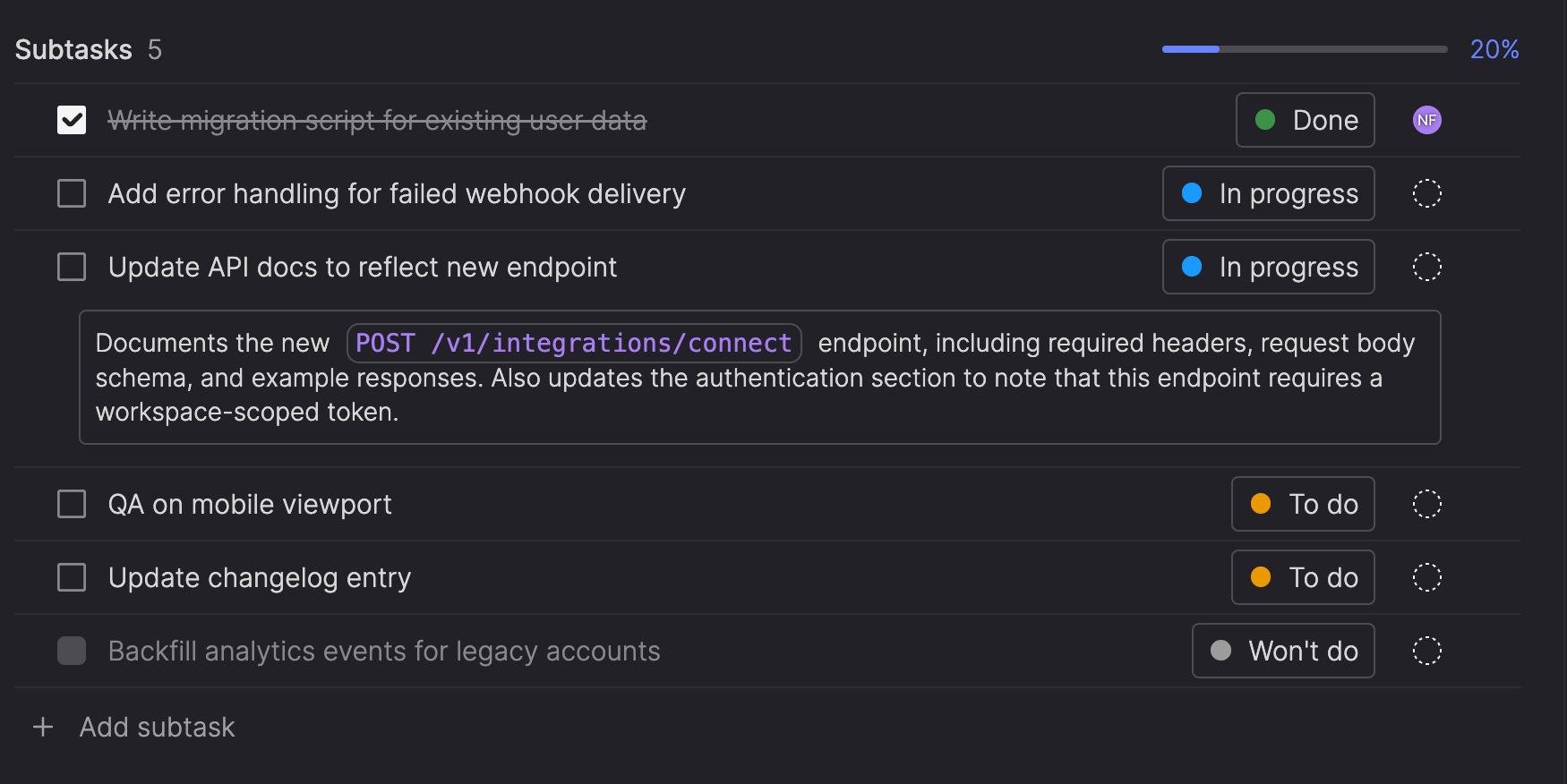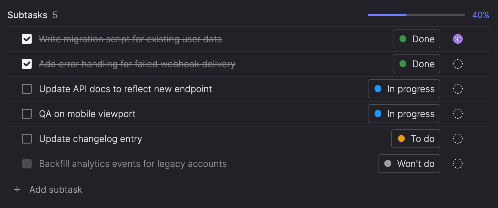 The subtask list includes a progress meter showing what percentage of subtasks are Done. Subtasks marked as Won't do are excluded from both the total and completed counts, so they don't skew your progress.