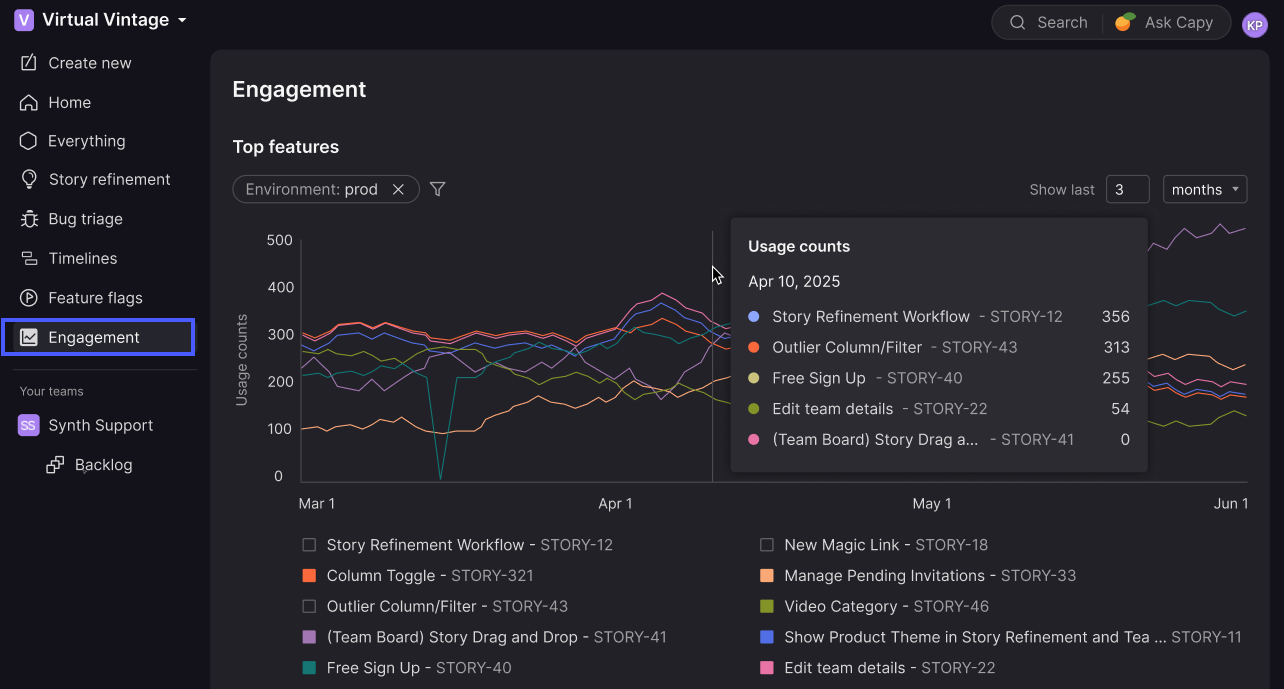 The Engagement page shows a graph of your top features, ranked by real usage. It builds on Feature engagement by moving beyond individual stories to reveal adoption trends across all tracked features. As you apply filters—by product theme, team, environment, completed date, customer, or location—the graph updates dynamically to highlight up to 10 features within that slice of data.
