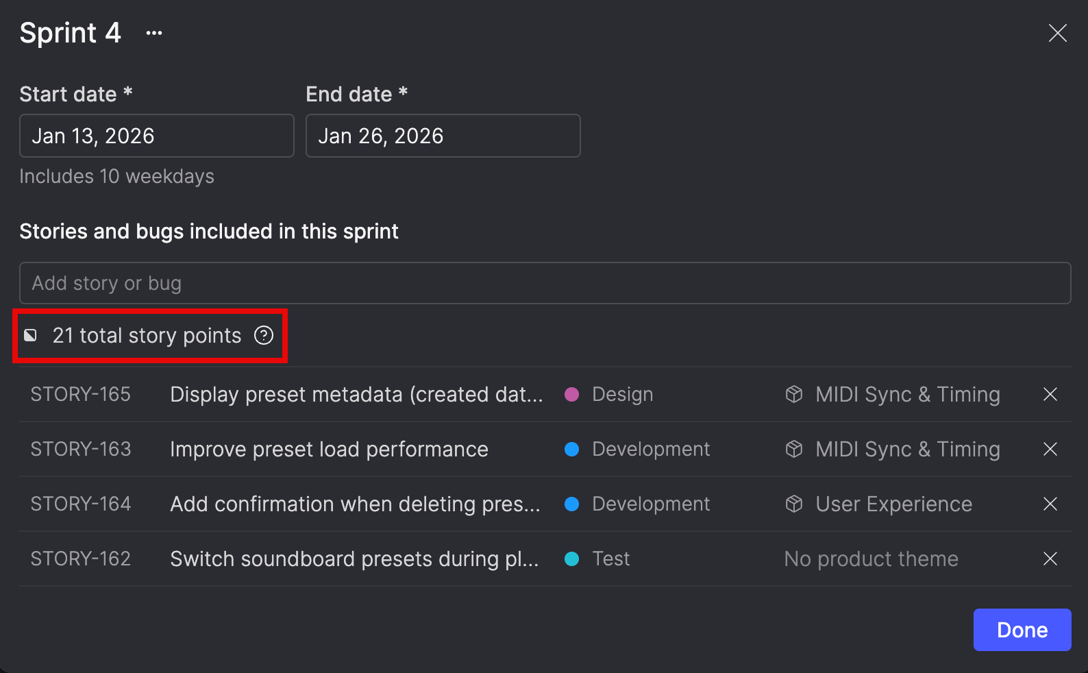 For Scrum teams, total story points are a core planning and tracking signal. They define sprint scope and appear on sprints in the Backlog, making it easy to see how much work is planned for each sprint.