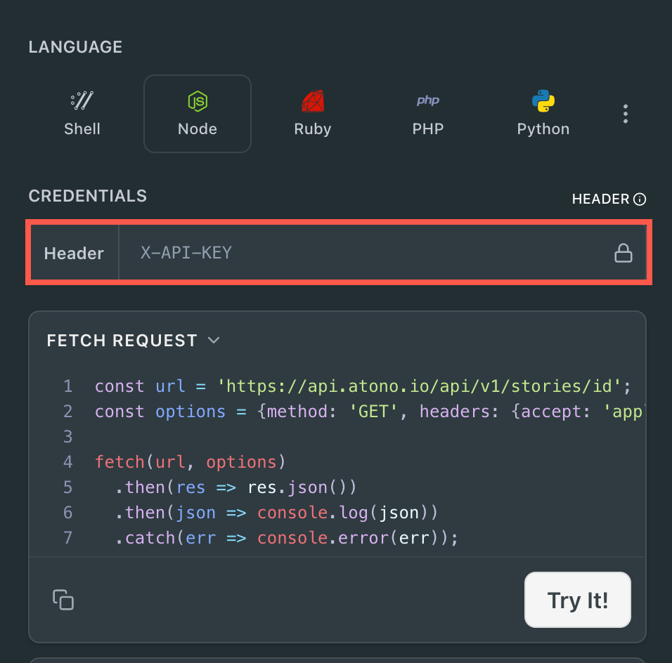 - Authenticate: In the right side panel, under CREDENTIALS, paste your API key into the Header field.